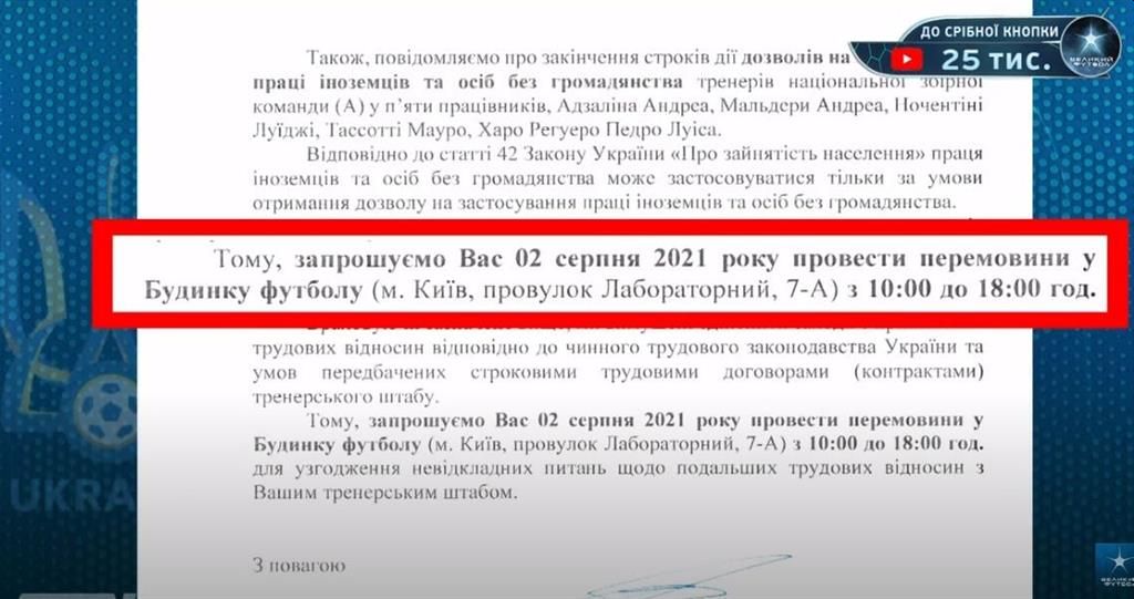 Украинская ассоциация футбола заявляет, что отправляла письмо бывшему главному тренеру сборной Украины Андрею Шевченко о встрече 2 августа с целью переговоров о продлении контракта.