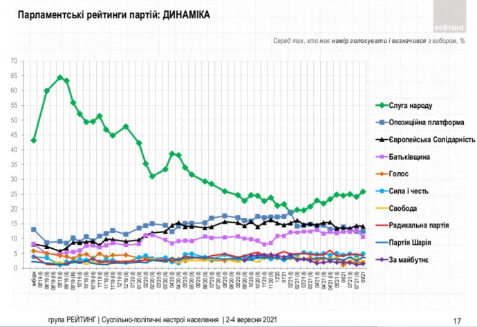 Рейтинг других политических сил значительно ниже. Так, партию "Сила и честь" поддерживают 4,9%, партию Мураева "Наши" - 4,7%, партию "Украинская стратегия Гройсмана" - 4,5%, Радикальную партию О.Ляшко - 4,2%, партию Шария - 3,6%, "УДАР Виталия Кличко" - 3,4%, условную партию Притулы - 3,2%.