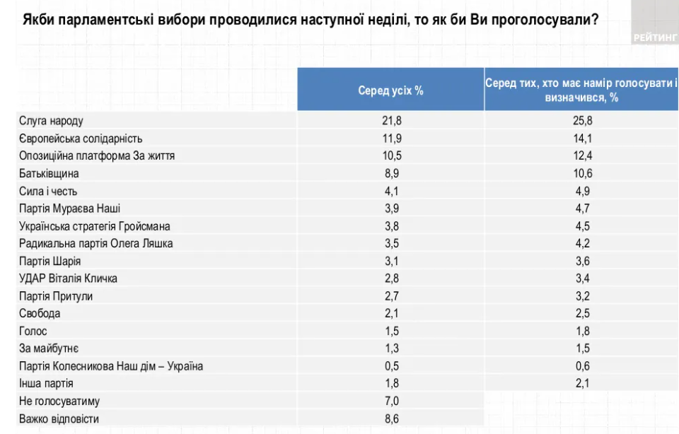 Рейтинг других политических сил значительно ниже. Так, партию "Сила и честь" поддерживают 4,9%, партию Мураева "Наши" - 4,7%, партию "Украинская стратегия Гройсмана" - 4,5%, Радикальную партию О.Ляшко - 4,2%, партию Шария - 3,6%, "УДАР Виталия Кличко" - 3,4%, условную партию Притулы - 3,2%.