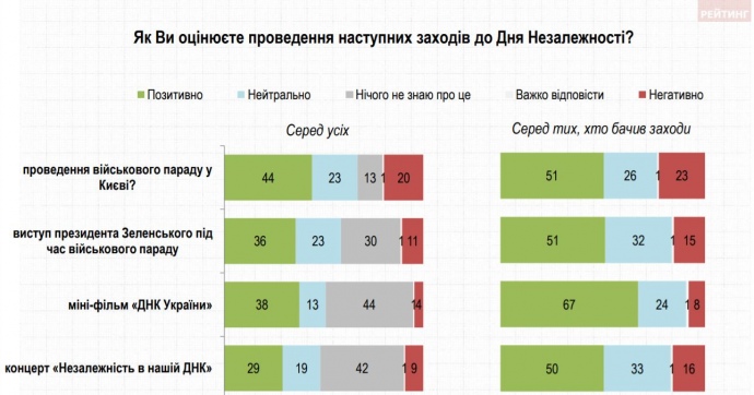 Мини-фильм "ДНК Украины" положительно оценили 38%, выступление президента Зеленского на параде - 36%, праздничный концерт на стадионе "Олимпийский" в Киеве - 29%".