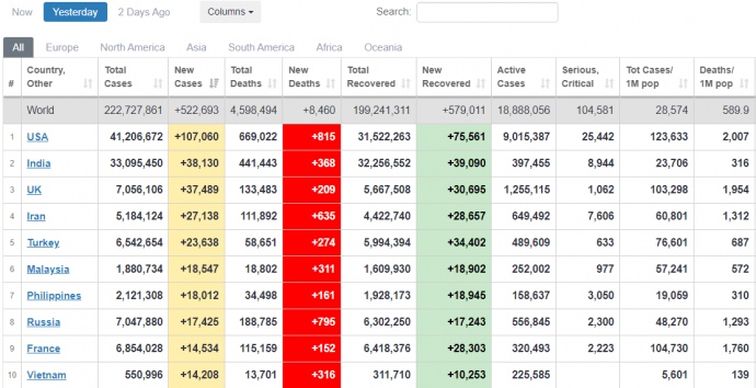 За сутки 6 сентября у 522693 человек в мире обнаружили коронавирус.