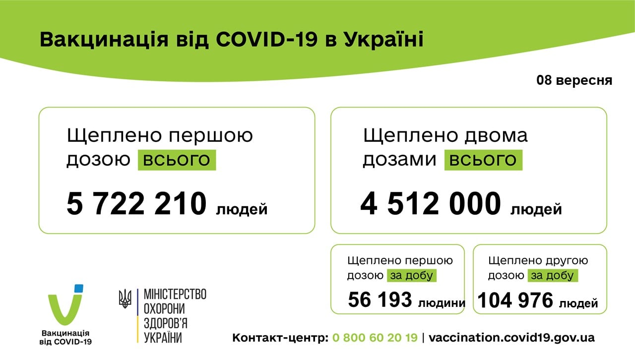 8 сентября в Украине 161 169 человек было привито против COVID-19: первую дозу вакцины получили 56 193 человека, вторую дозу – 104 976 человек.