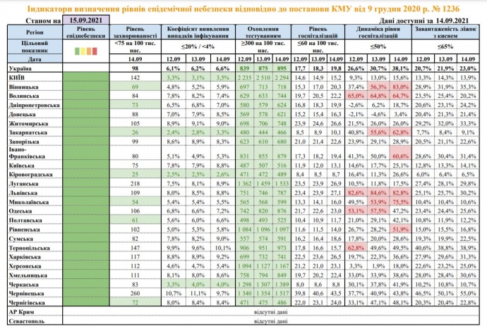 В 18-ти из 25 регионов Украины превышен пороговый уровень заболеваемости COVID-19, в 7-ми регионах по состоянию на 14 сентября была превышена динамика уровня госпитализаций.