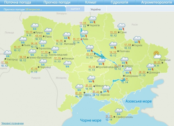 Дословно: "В Украине (18 сентября), кроме крайнего востока, умеренные дожди, местами грозы; ночью в большинстве западных и северных областей, днем местами в центральных, южных и северо-восточных областях значительные дожди".