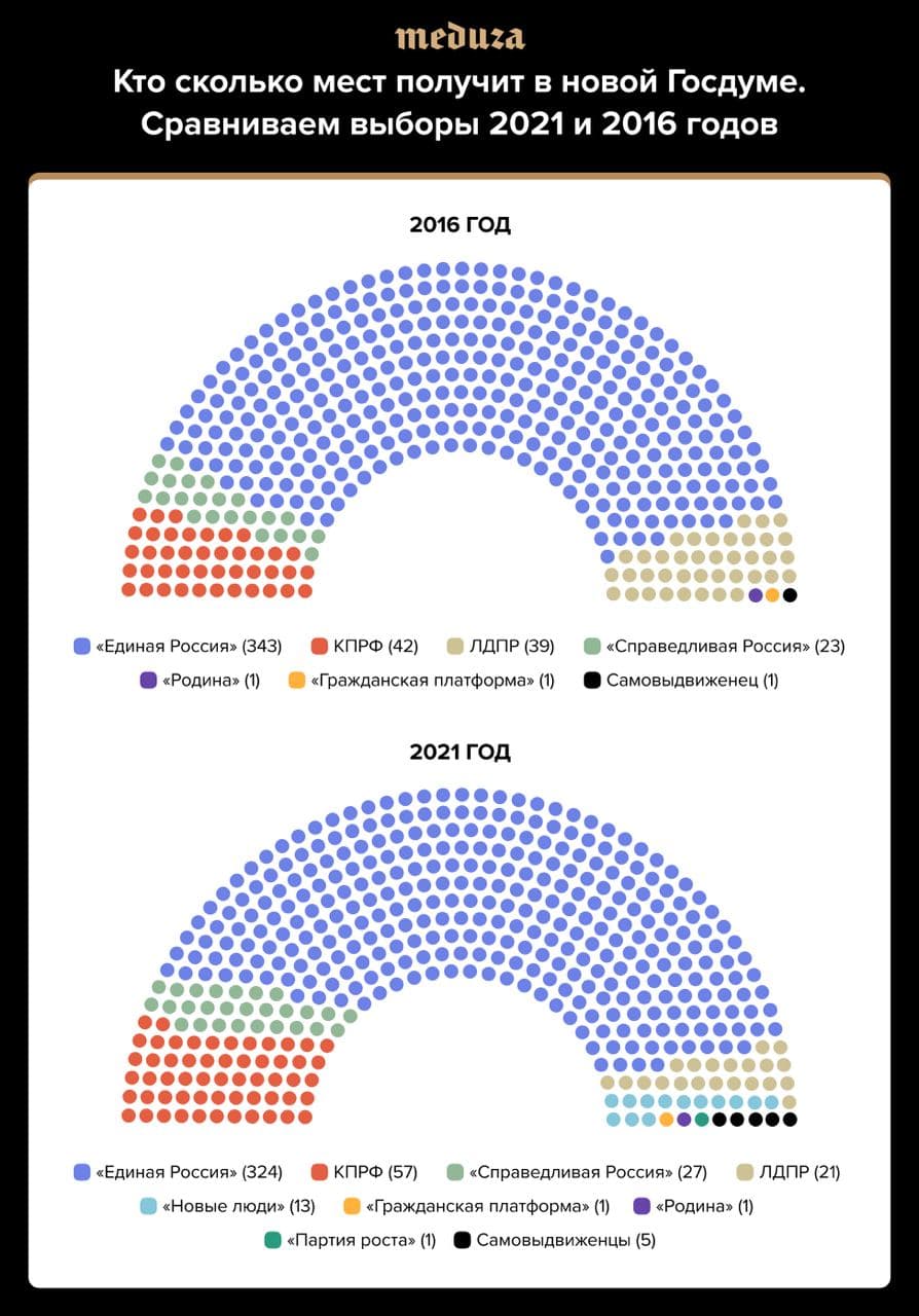 Предыстория: 21 сентября российская ЦИК объявила, что на выборах в Госдуму "Единая Россия" после обработки 100% протоколов набирает 49,82% голосов, а КПРФ - 18,93%.