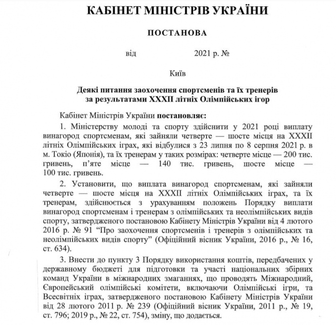 Украинским спортсменам, которые завоевали 4-6 место на Олимпийских играх в Токио, государство выплатит от 100 до 200 тысяч гривен вознаграждения.