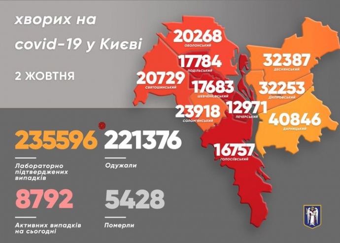 Всего с начала пандемии в Киеве обнаружили 235 596 случаев коронавируса, умерло 5428 больных, выздоровели 221 376 человек.