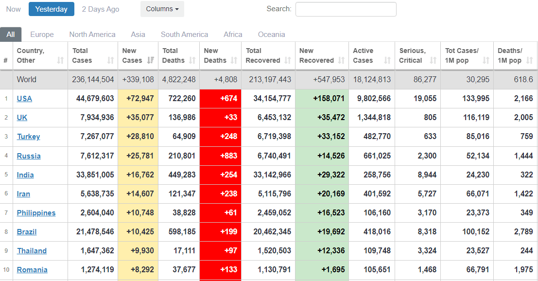 За сутки 3 октября у 339 108 человек в мире обнаружили COVID-19.