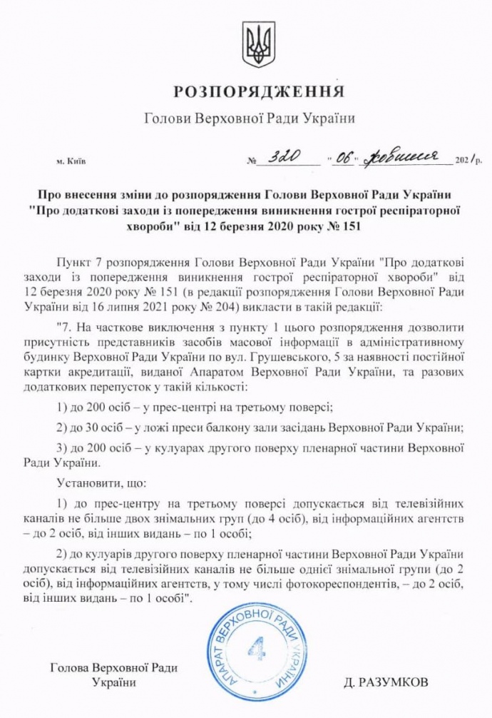 - 12 марта 2020 года, с началом карантина, глава Верховной Рады Дмитрий Разумков подписал распоряжение "О дополнительных мерах по предупреждению возникновения острой респираторной болезни". Журналистов в парламент на период карантина пускали только в пресс-центре на 3 этаже, кулуары 2 этажа для журналистов были закрыты. Также работникам СМИ ограничили допуск в админздания парламента.