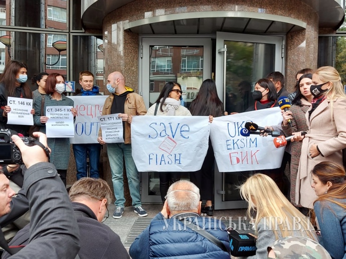На улице Антоновича перед зданием проходит акция протеста против противоправных действий, допущенных руководством и охраной банка, которые изымали технику у журналистов и пытались уничтожить отснятый материал.