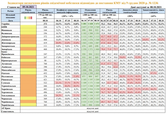 По сравнению с показателями от 7 октября, к перечню "оранжевых" добавились Киевская и Львовская области, однако из него вышла Одесская область, которая уже обозначена как "желтая".