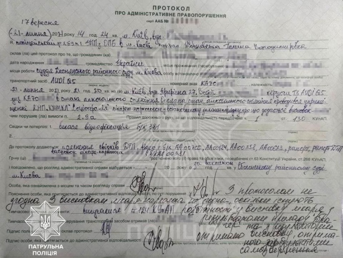 Первый заместитель начальника Департамента патрульной полиции Алексей Билошицкий в сентябре публиковал фото протокола, в котором была ссылка на заключение врача-нарколога с указанием того, что Колегаева руководила авто в состоянии алкогольного опьянения.