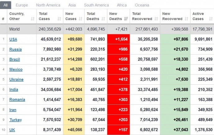 За все время пандемии вылечились от недуга 217 682 620 человек. Сейчас насчитывается около 18 млн активных случаев заболевания.