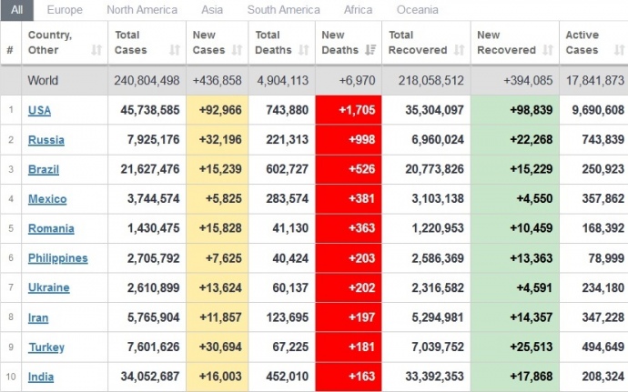 За все время пандемии вылечились от недуга 218094215 человек. Сейчас насчитывается около 18 млн активных случаев заболевания.