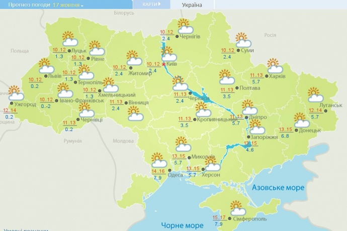 Температура ночью 1-6° тепла, днем 8-13° (в Карпатах в течение суток от 4° тепла до 1° мороза), в южной части ночью 6-11° тепла, днем 11-16°.