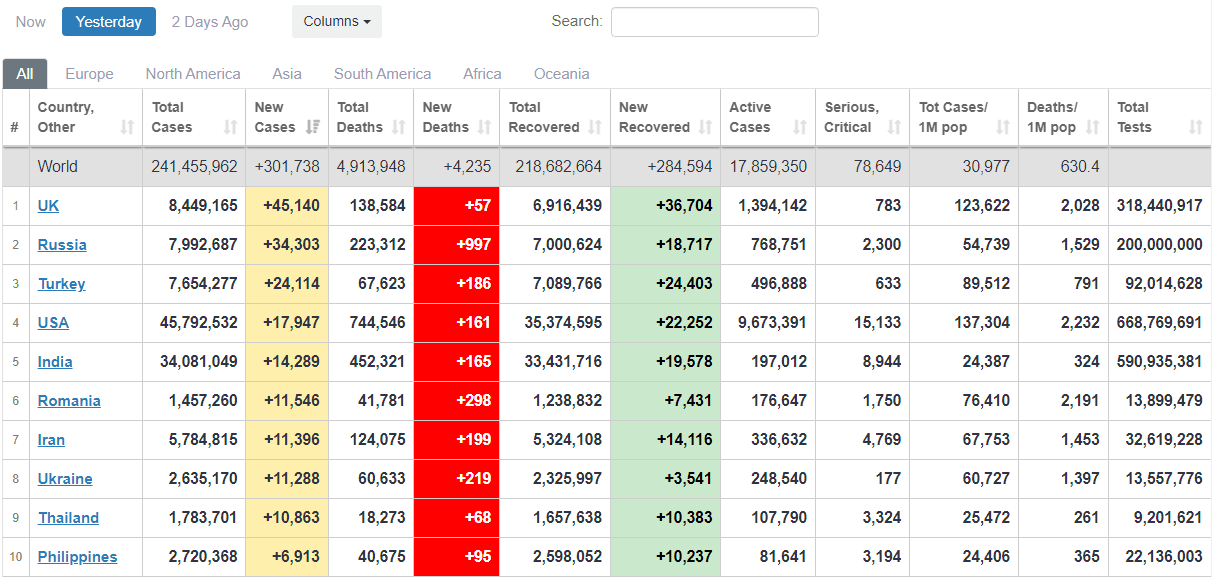 16 октября в мире обнаружили 301 738 новых случаев COVID-19.