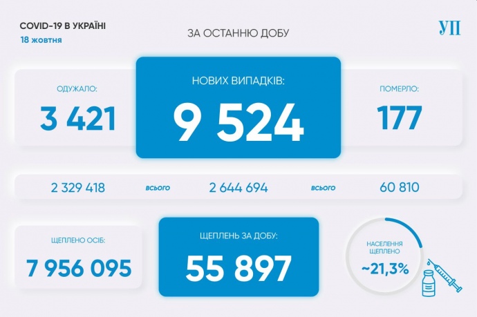 В воскресенье 17 октября в Украине зафиксировали 9 524 случая заболевания коронавирусной болезнью и 177 летальных случаев от нее, госпитализировали с Covid-19 или подозрением на него 3 127 человек, выздоровел 3 421 человек.