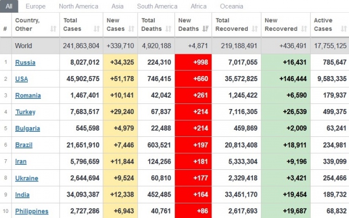 С начала пандемии подтверждено 4 920 476 смертей от COVID-19.