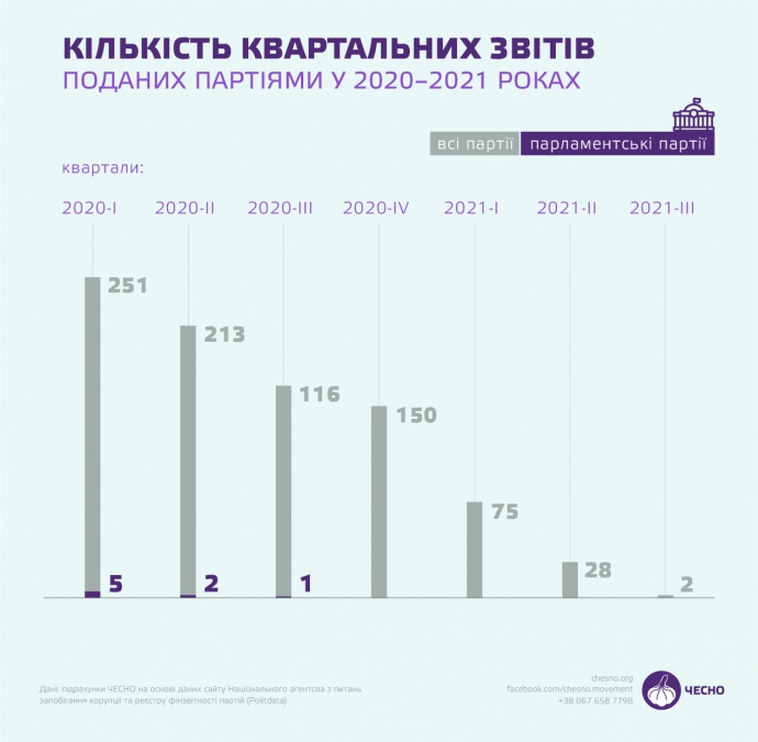 Если отчеты за первый квартал 2020 года подала 251 партия, то за первый квартал этого года – 75, а за второй квартал – только 28 или 7,4% от общего количества зарегистрированных в Украине политических сил (около 380).