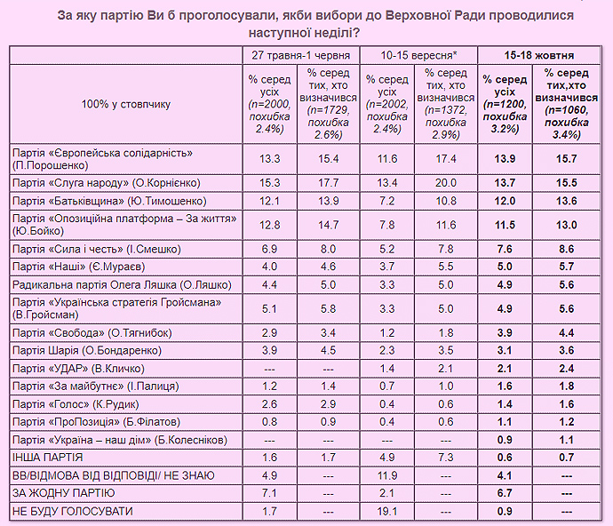 Дословно: "Если бы в выборах участвовали указанные партии, то относительно самую высокую поддержку имели бы четыре партии: "Европейская солидарность" (15,7% среди тех, кто определился с выбором), "Слуга народа" (15,5%), "Батькивщина" (13,6%) и "ОПЗЖ" (13%)".