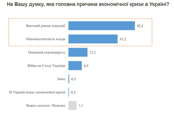 Если говорить о главной причине экономического кризиса, то среди предложенных четырех вариантов 42,1% респондентов говорят о высоком уровне коррупции, а 31,2% – о некомпетентности власти.