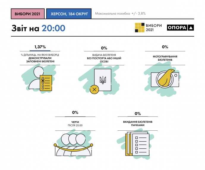 Вместе с тем, наблюдатели ОПОРЫ констатируют отсутствие массовых нарушений избирательных процедур со стороны членов УИК и других субъектов избирательного процесса на внеочередных выборах харьковского городского головы и промежуточных выборах народных депутатов в ОВО №184 (Херсонская обл.) и ОВО №197 (Черкасская обл.) в период между 16:00 и 20:00.