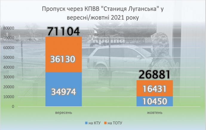 Детали: Если в сентябре текущего года КПВВ "Станица Луганская" пересекли более 71 тысяч человек, то в октябре - менее 27 тысяч человек.