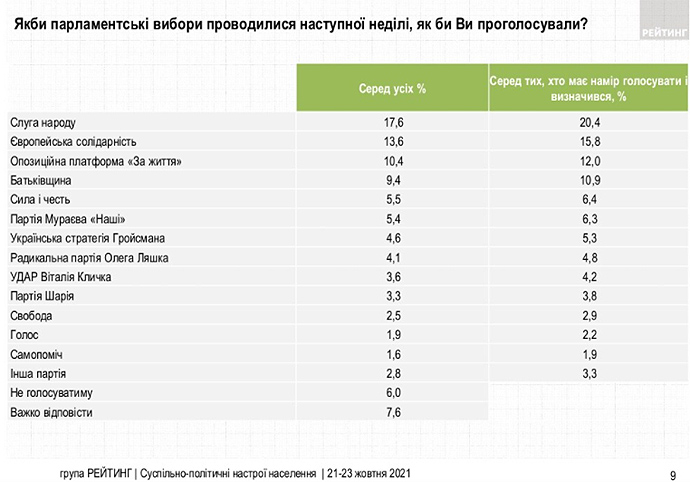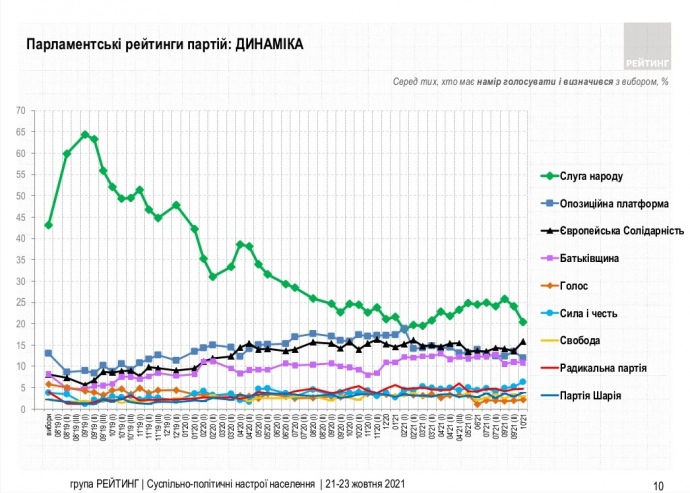- Согласно опросу "Рейтинга", проведенному в начале сентября, "Слугу народа" поддерживали 25,8% среди тех, кто будет голосовать и определился с выбором, "Европейскую солидарность" – 14,1%, "Оппозиционную платформу – За жизнь" – 12,4%, и "Батькивщину" – 10,6%.