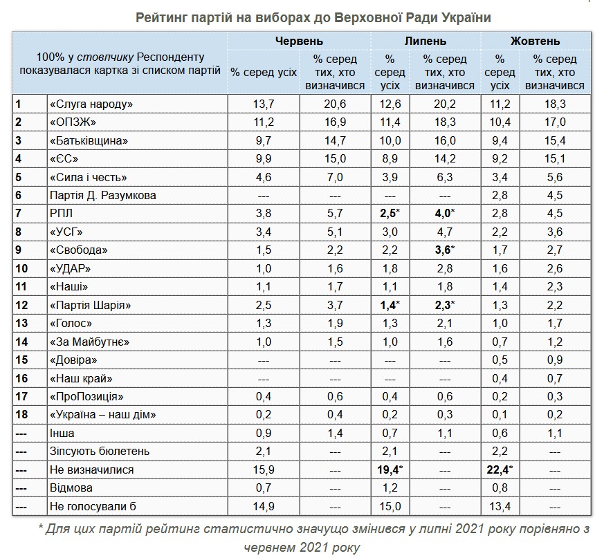 Если бы выборы в парламент проходили в конце октября, за партию "Слуга народа" проголосовали бы 18,3% среди определившихся с выбором за "Оппозиционную платформу – За жизнь" - 17%. Разница в пределах погрешности.