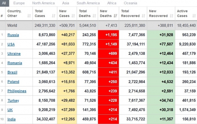 За все время пандемии излечились от болезни 225 839 106 человек. В настоящее время насчитывается более 18 млн. активных случаев заболевания.