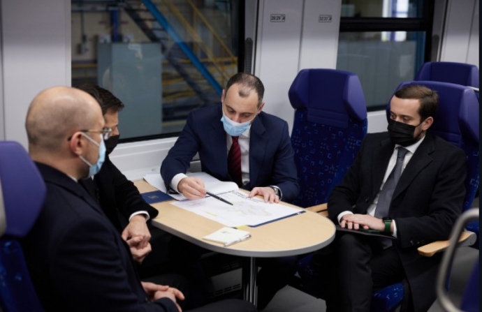 Его сопровождали министр инфраструктуры Александр Кубраков, председатель наблюдательного совета ПАО "Крюковский вагоностроительный завод" Владимир Приходько, премьер-министр Денис Шмигаль и замглавы офиса президента Кирилл Тимошенко.