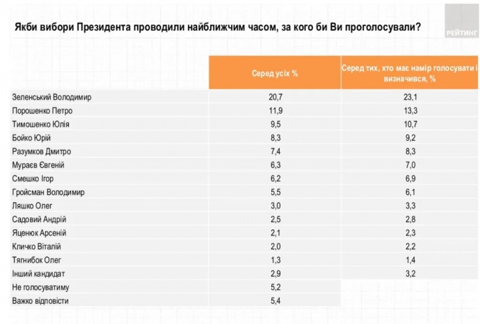 13,3% поддержали бы П.Порошенко, 10,7% – Ю.Тимошенко, 9,2% – Ю.Бойко, 8,3% – Д.Разумкова, 7,0% – Е.Мураева, 6,9% – И.Смешко, 6,1% – В.Гройсмана, 3,3% – А.Ляшко. Рейтинги других кандидатов – менее 3%.