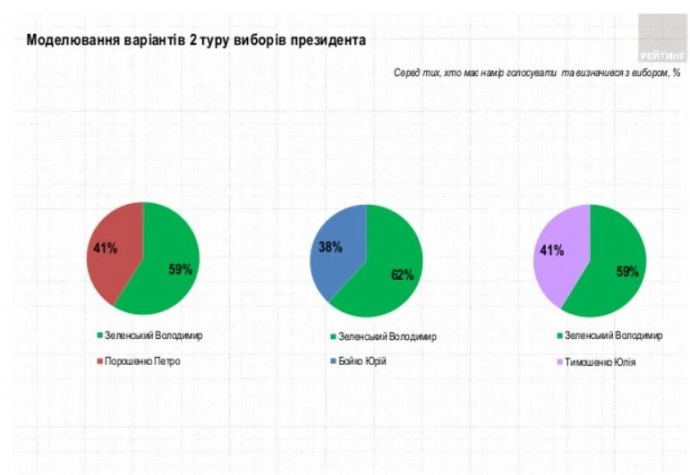 В паре Зеленский-Тимошенко – 59% против 41%, в паре Зеленский-Бойко – 62% против 38%.