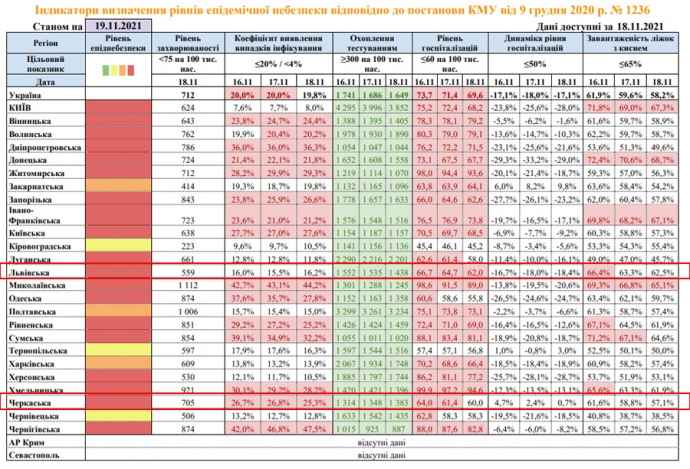 Детали: Во Львовской области 2 дня подряд снижается загруженность кроватей с кислородом для covid-больных, а в Черкасской области начало снижаться количество госпитализаций.