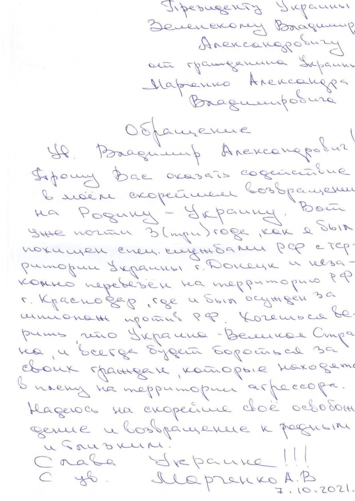 Александр Марченко написал открытое письмо президенту Украины Владимиру Зеленскому. Он надеется, что Украина всегда будет бороться за своих граждан, которые находятся в плену на территории агрессора.