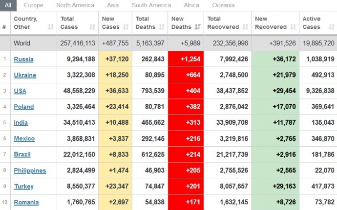 За все время пандемии излечились от недуга 232 383 182 человека. В настоящее время насчитывается более 19 млн активных случаев заболевания.