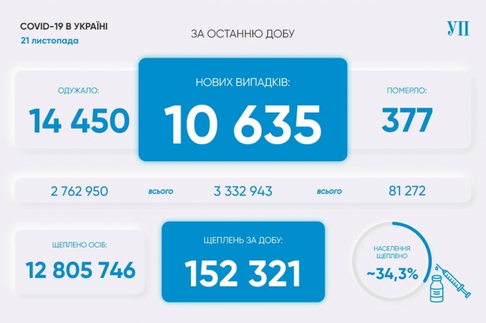 За сутки 20 ноября в стране обнаружили 10,6 тыс. новых случаев коронавируса, болезнь унесла жизни 377 украинцев.