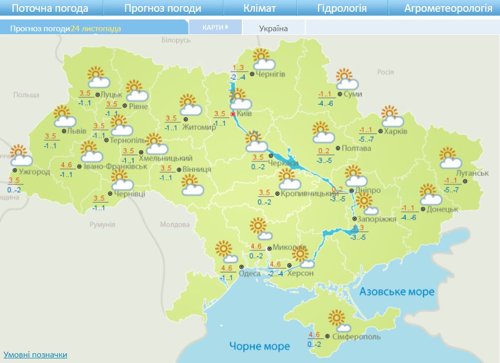 В среду 24 ноября в Украине прогнозируется сухая погода, однако ночью в северных, центральных областях и в Карпатском регионе местами небольшой мокрый снег, а на дорогах гололедица.