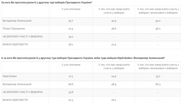 Дословно: "В. Зеленский в случае электорального соперничества во втором туре с П. Порошенко получил бы 26% голосов всех опрошенных или 54% голосов тех, кто примет участие в выборах и определился, за кого будет голосовать, П. Порошенко соответственно 22% и 46%".
