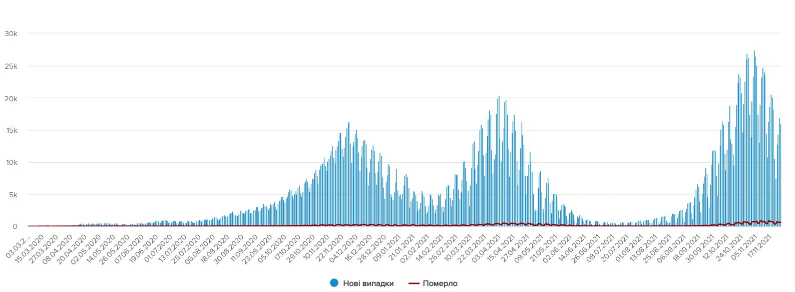 За сутки 25 ноября в Украине зафиксировали 15 936 случаев заболевания коронавирусной болезнью и 608 смертей от нее, госпитализировали с Covid-19 или подозрением на него 3 208 человек, выздоровели 24 569 человек.