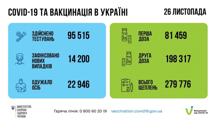 За сутки 26 ноября в Украине зафиксировали 14 200 новых подтвержденных случаев коронавируса и 568 смертей от него.