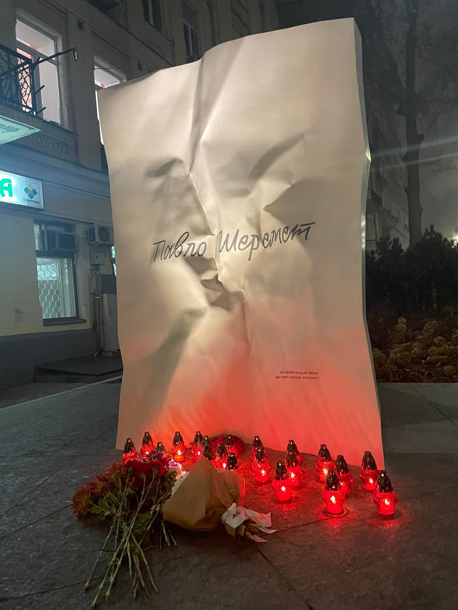 Они собрались возле памятника Шеремету на пересечении улиц Богдана Хмельницкого и Ивана Франко, где и погиб журналист.