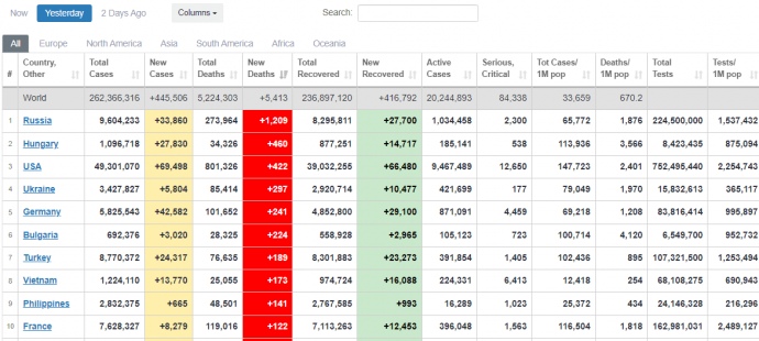 5 413 людей в мире за сутки умерли, больше всего в России, Венгрии и Штатах. По этому показателю Украина находится на 4 месте в мире и на 3 – в Европе.
