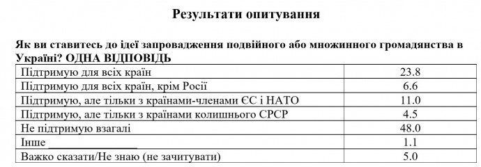 Дословно: "48% респондентов не поддерживают вообще идею введения двойного или множественного гражданства в Украине.