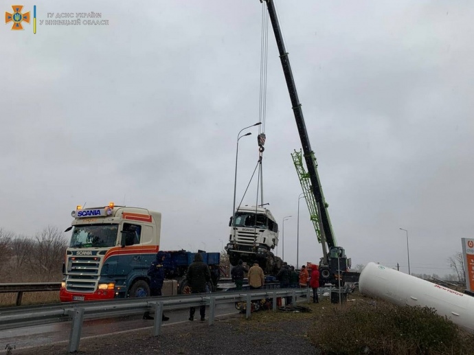 Дословно: "3 декабря в 6:23 в Службу спасения "101" поступило сообщение о том, что на Черкасском шоссе г. Винница на автодороге М30 Стрый-Тернополь-Кропивницкий-Знаменка-Луганск-Изварино перевернулся автомобиль, который использовался для транспортировки газа".