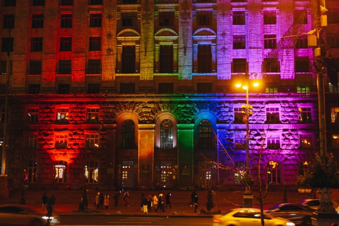 Киевскую городскую государственную администрацию подсветили цветами ЛГБТКИ-символики по случаю Международного дня прав человека.