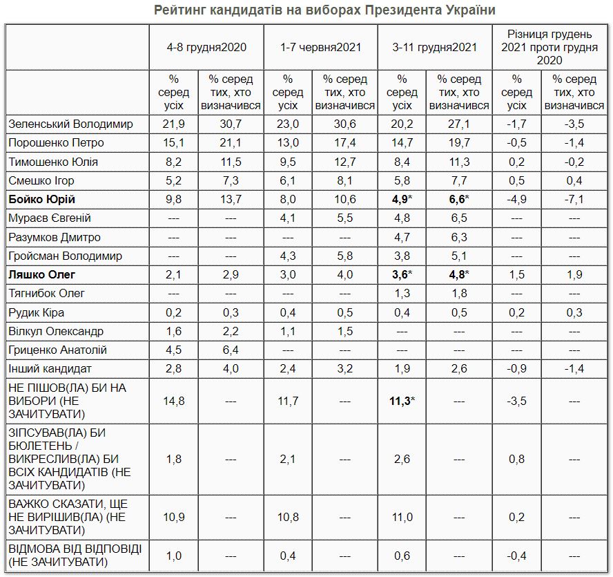 В то же время, за год рейтинг Юрия Бойко среди определившихся снизился вдвое - с 13,7% в декабре 2020 года до 6,6% в декабре 2021 года.