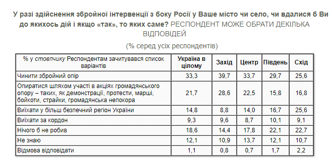 Детали: В целом каждый третий респондент – 33,3% – готов оказывать вооруженное сопротивление. Готовы сопротивляться путем участия в акциях гражданского сопротивления – 21,7%.