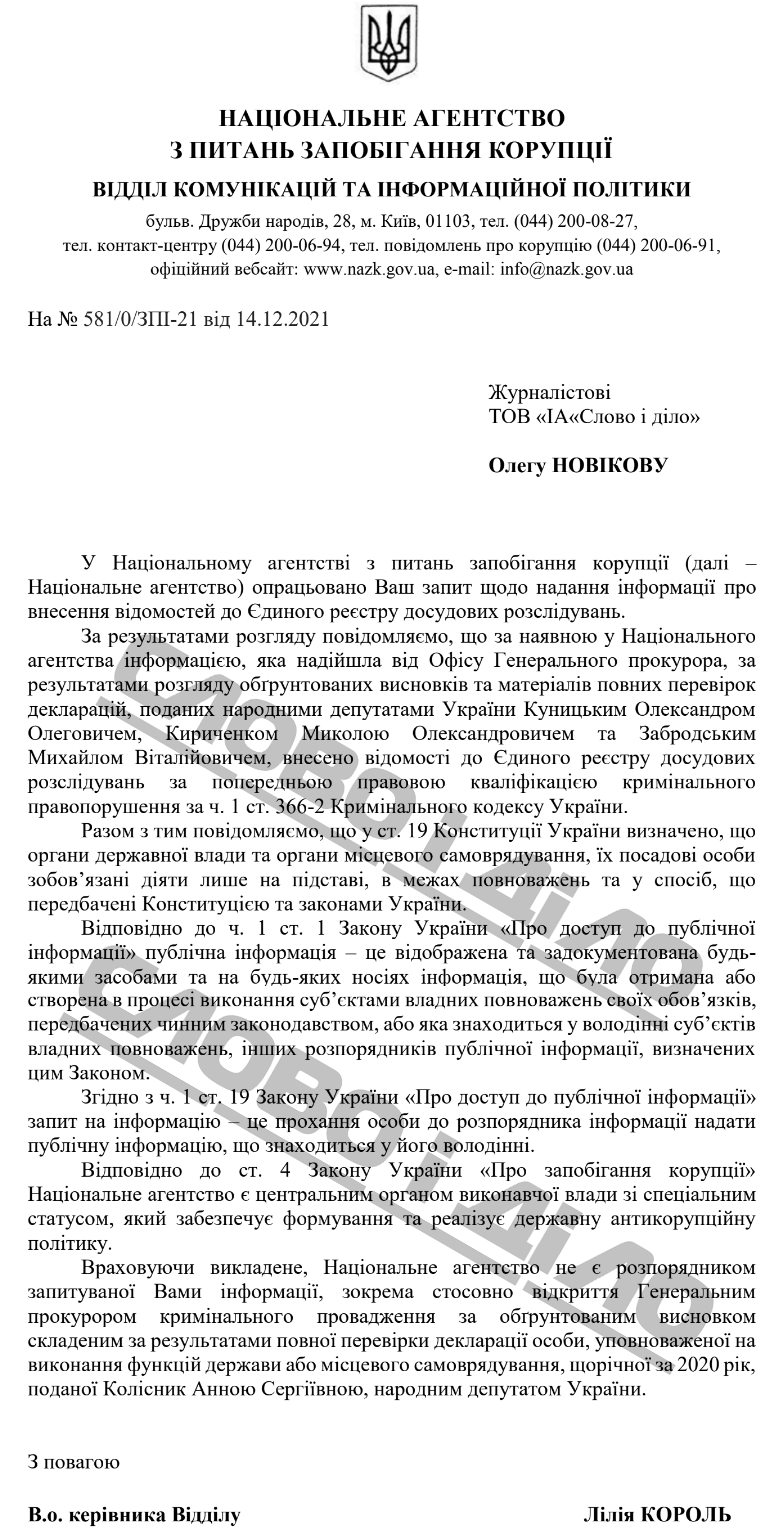 Дословно: "По результатам рассмотрения сообщаем, что по имеющейся у Национального агентства информации, поступившей от Офиса генерального прокурора, по результатам рассмотрения обоснованных выводов и материалов полных проверок деклараций, поданных народными депутатами Александром Куницким, Николаем Кириченко и Михаилом Забродским, внесены сведения в Единый реестр досудебных расследований по предварительной квалификации уголовного правонарушения по части 1 статьи 366-2 Уголовного кодекса Украины (недостоверное декларирование)".