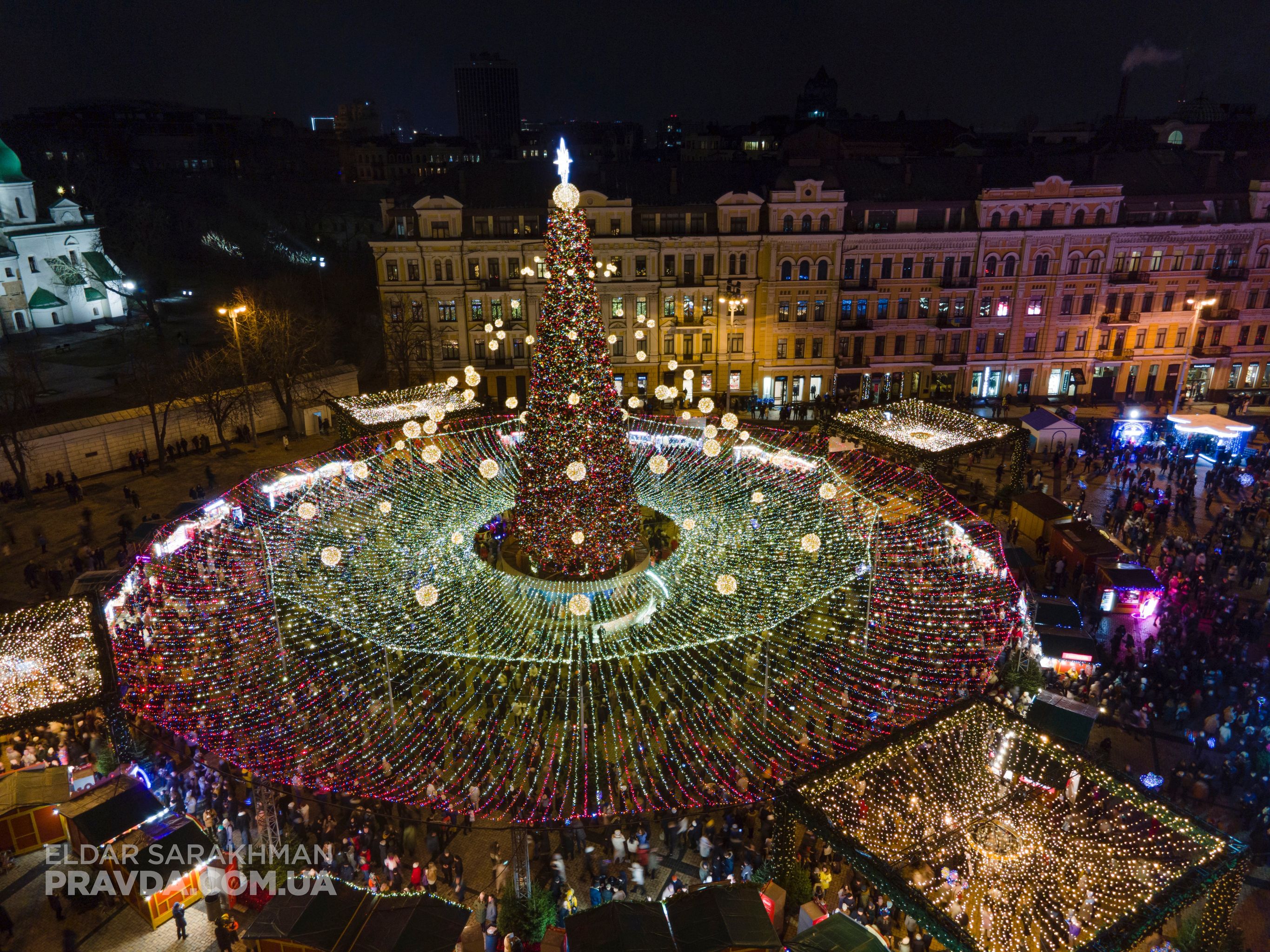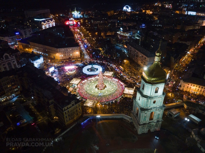 На Софийской площади в Киеве состоялась торжественная церемония зажигания огней главной елки страны, ее высота превышает 30 метров.